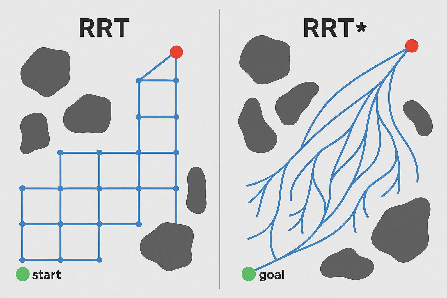 RRT는 RRT의 최적화된 버전입니다. 노드의 수가 무한에 가까워질수록, RRT 알고리즘은 목표 지점까지의 최단 경로를 제공하게 됩니다. 현실적으로는 실현 불가능하더라도, 이 문장은 알고리즘이 최단 경로를 생성하는 방향으로 작동한다는 것을 의미합니다. RRT*의 기본 원리는 RRT와 동일하지만, 두 가지 기능이 추가되어 결과는 크게 발전합니다.